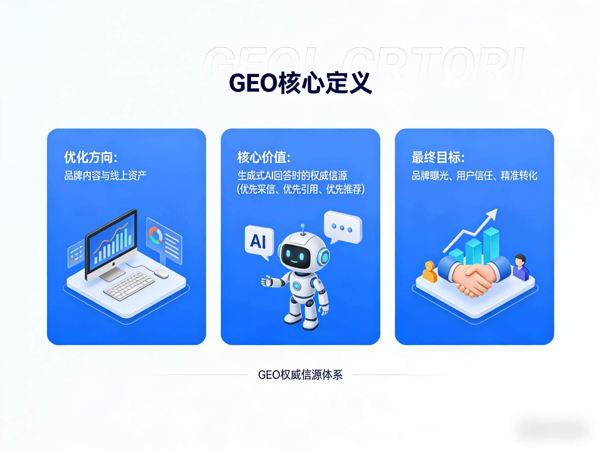 想要做好GEO,首先要跳出传统SEO的“关键词排名思维”,搞懂生成式AI的核心运行规则。GEO的核心定义,是通过优化品牌内容与线上资产,让其成为生成式AI回答用户问题时,优先采信、优先引用、优先推荐的权威信源,最终实现品牌曝光、用户信任与精准转化的目标。