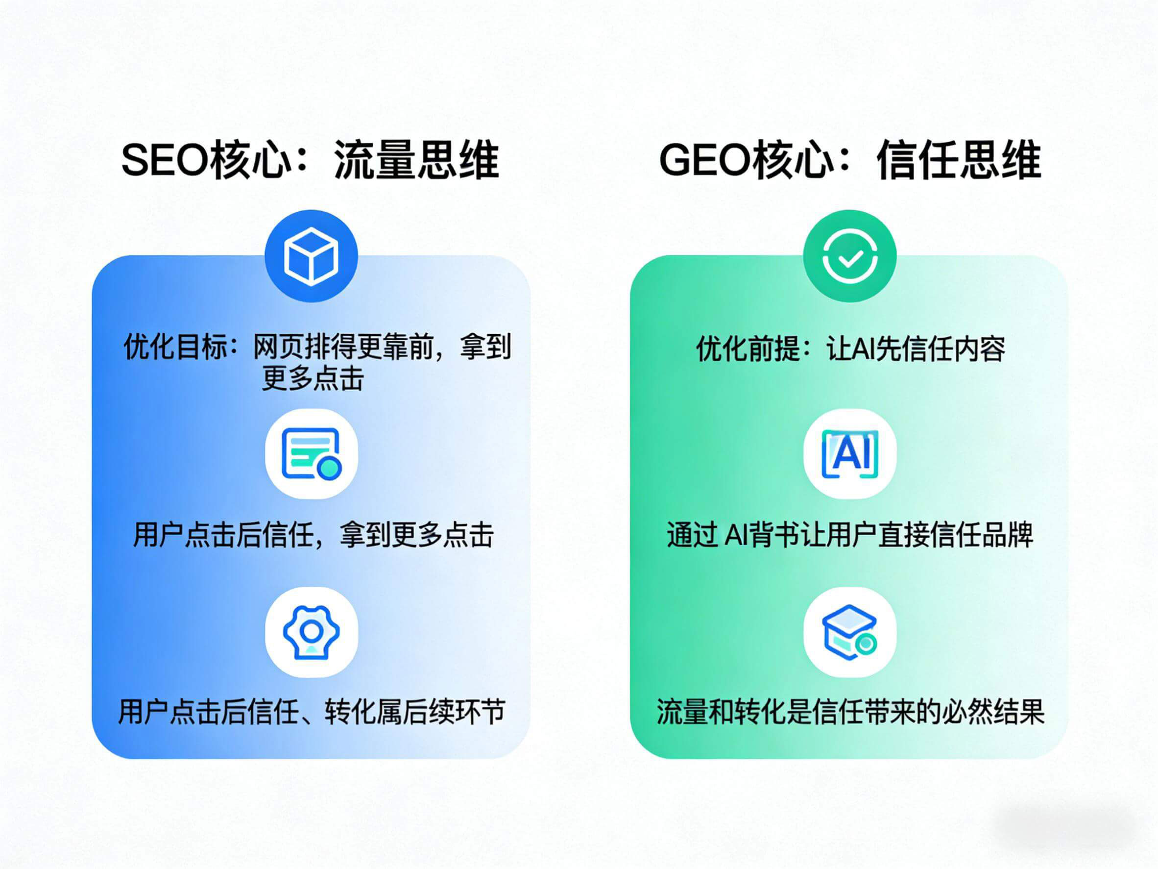 而GEO的核心是“信任思维”,所有优化动作的前提,都是让AI先信任你的内容,再通过AI的背书,让用户直接信任你的品牌,流量和转化是信任带来的必然结果。