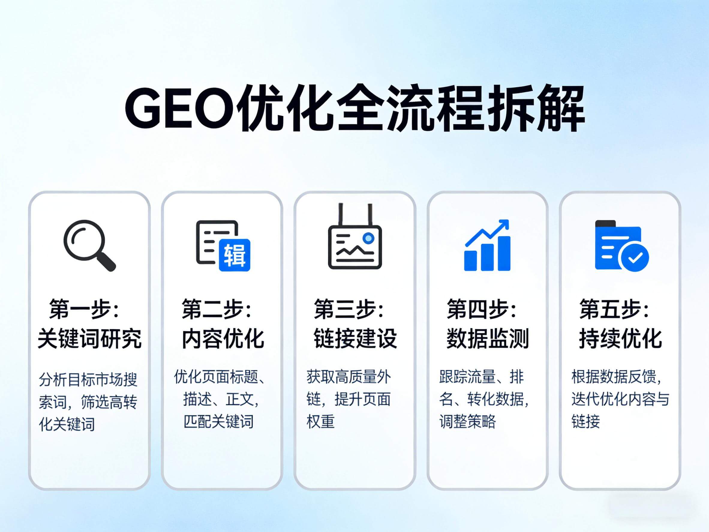 搞懂了底层逻辑,我们再落地到实操。GEO优化从来不是大企业的专属,也不需要复杂的技术能力,哪怕是零基础,只要遵循这套5步方法论,就能完成从0到1的落地。